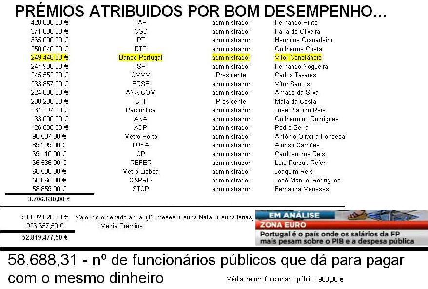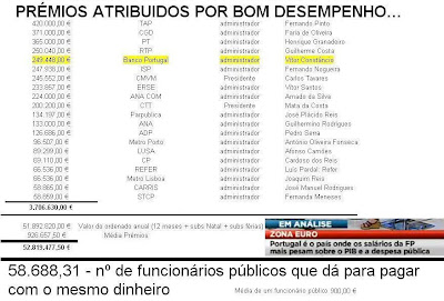 Lembrei-me logo de um email que recebi, com os Ordenados e média de Prémios de 20 Funcionários "Especiais de Corrida" e o que, estes, 20 ganharam num ano, em ordenados e prémios (mesmo c/ gestão que deu prejuízo) dava para pagar a 58.688 Funcionários normais que recebessem um ordenado de 900€.